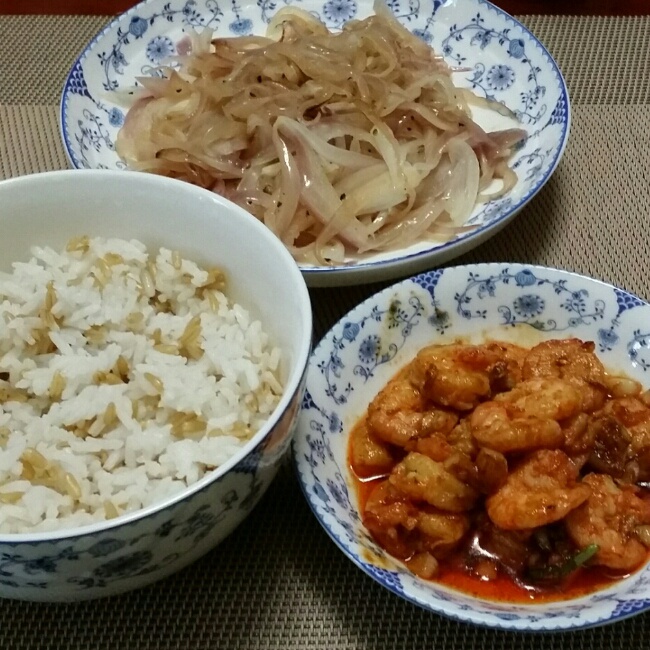 糙米饭+黑椒炒洋葱+炒虾仁=只有550卡路里,适合自己瘦身晚餐O(∩_∩)O