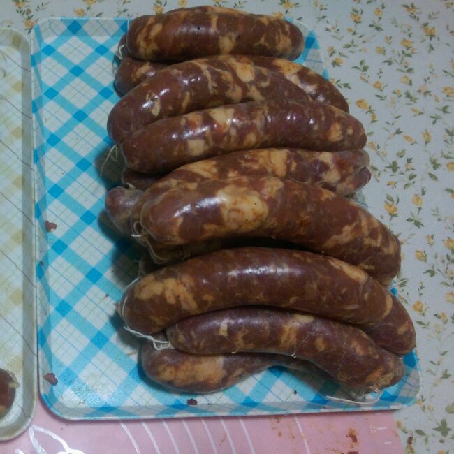 经过两小时的切肉、半天的腌制、两小时的灌制,12斤前腿肉让我变成了这样,杨氏纯手工香肠终于出炉了。。。。。