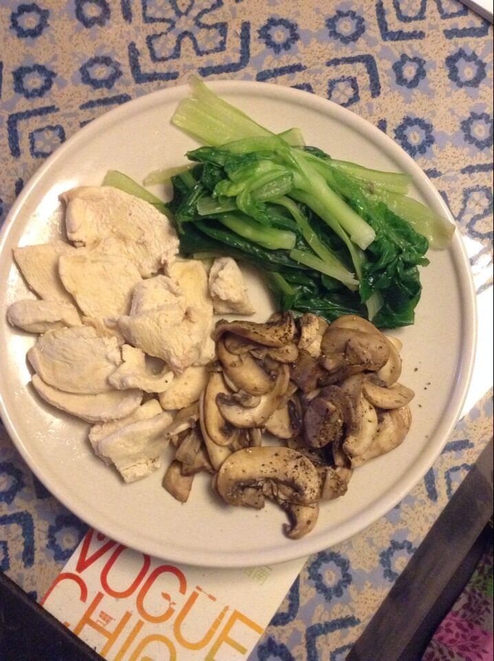 晚餐:水煮青菜+水煮鸡胸+口蘑三颗