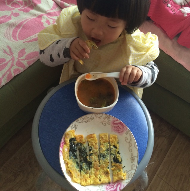 甜宝贝早餐--鸡蛋洋葱碎海苔饼+番茄牛肉丸汤+水果