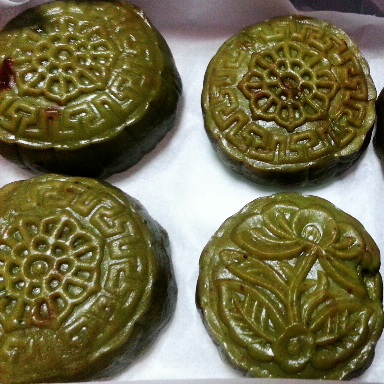 抹茶味冰皮月饼,刚压出来花纹还好,一会花纹就不明显了,一个晚上过去会不会变大饼。。。