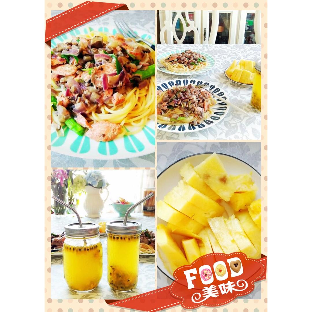 璀璨大星空 做过 早餐-2017.1.12 #早餐-2017.1.12#上午好!晚早餐。[哈哈]三文鱼奶油香菇意面意面+百香果蜂蜜水。再来一盘菠萝,维生素妥妥滴。🍁附意面做法: http://t.cn/RMSiUDy #早餐•2017年1月12日# 2017-01-12