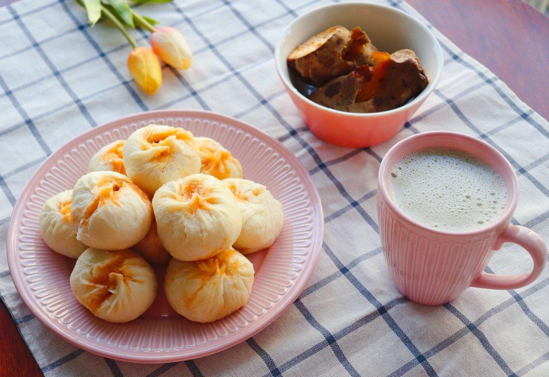 肉包、黄绿豆豆浆、烤红薯