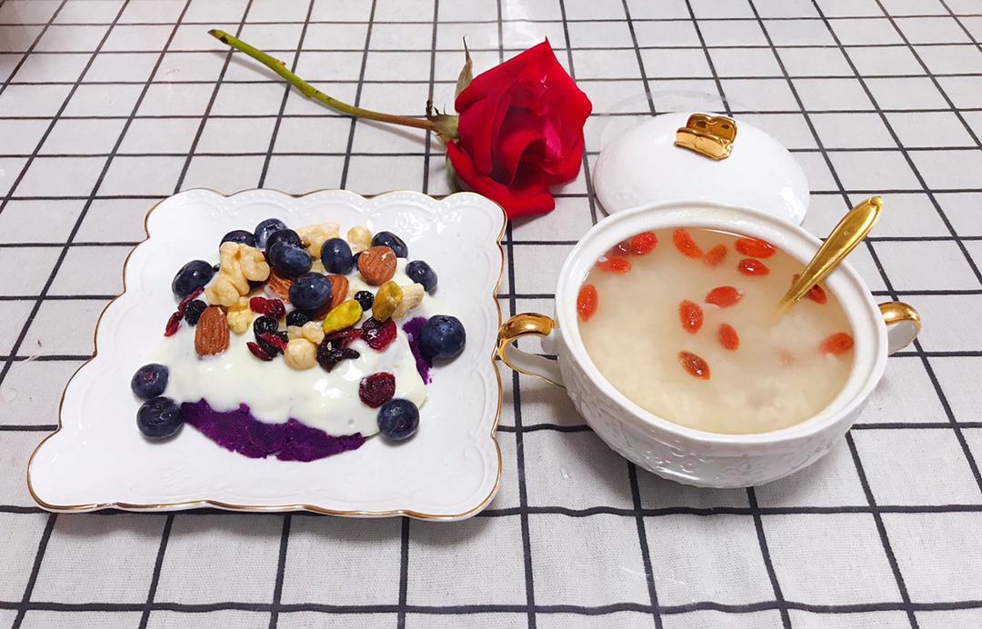 早餐 紫薯酸奶、甜酒小丸子。紫薯蒸熟压成泥倒一瓶酸奶在放一包坚果几颗蓝莓。