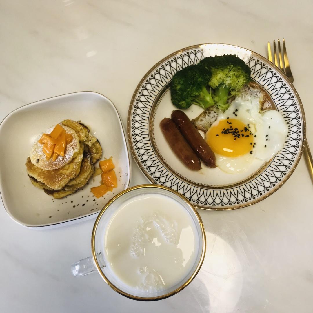 芒果松饼,煎蛋,维也纳香肠,蔬菜和牛奶