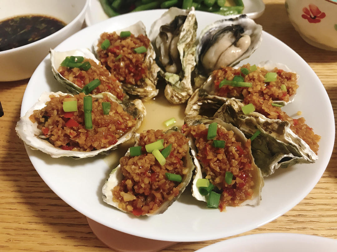 叔叔大叔叔 做过 晚餐•2020年9月1日 微波炉中火叮五分钟即可蒜蓉:大量蒜,少许姜和小米辣,葱白,搅碎。小火炒一半,炒至干香后下另一半,调料:生抽糖蚝油少许水。(可以不再放盐,因为生蚝本身有咸味)蒸了两原味,感觉有点咸,可以冲洗几遍,洒少许水。#晚餐•2020年9月1日# 2020-09-01