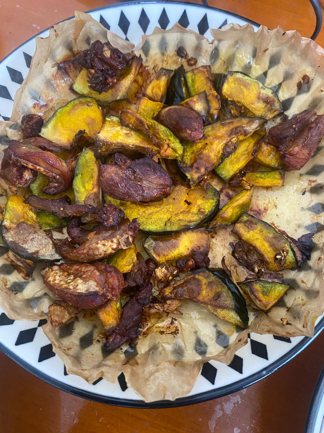鸡腿撕碎成肉块块做的 底下垫的贝贝南瓜 还可以