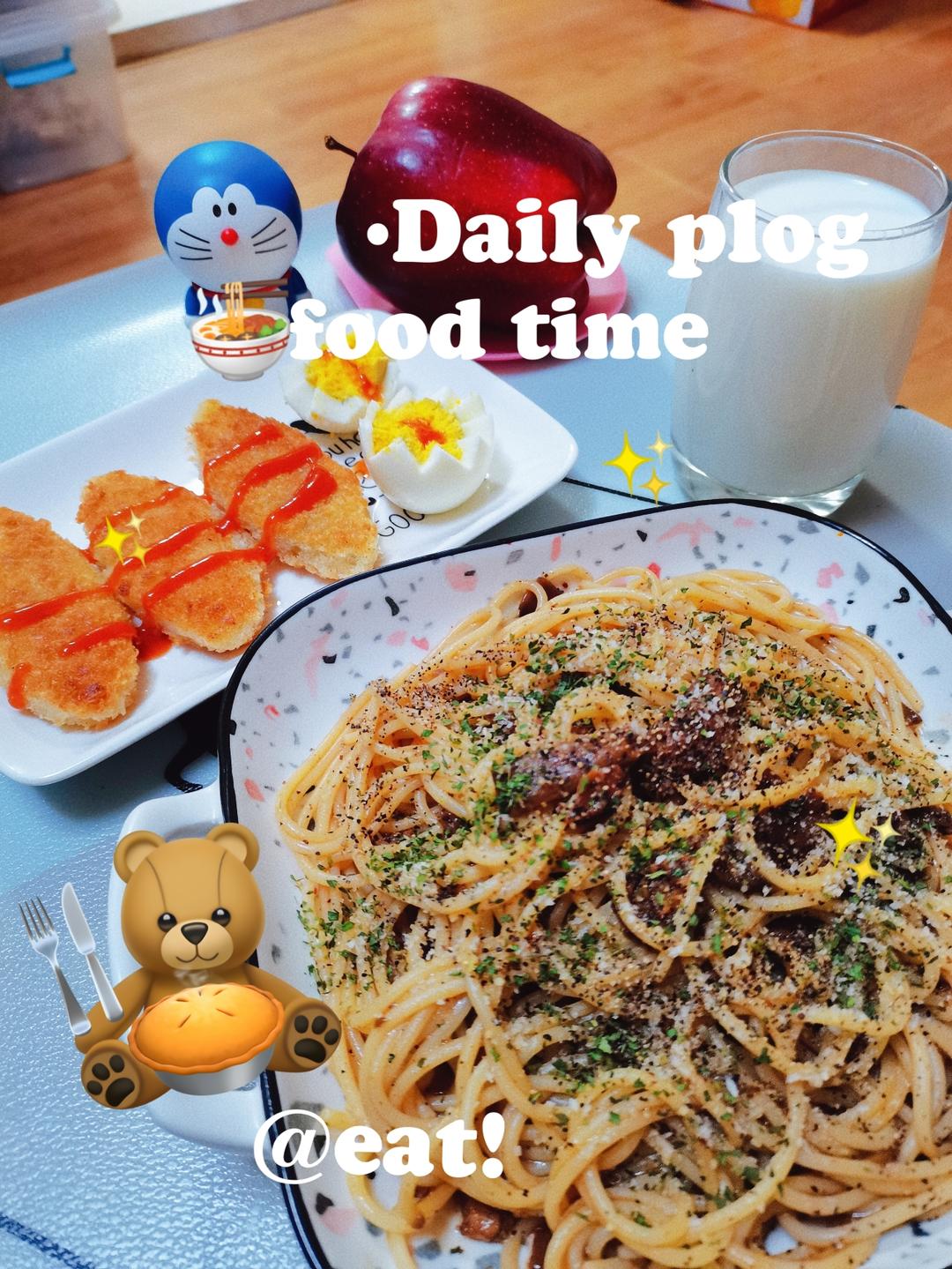 🎈今日份餐食:黑椒牛柳意面🍝,煎鳕鱼饼🐟,白水煮鸡蛋🥚,蛇果🍎和牛奶🥛