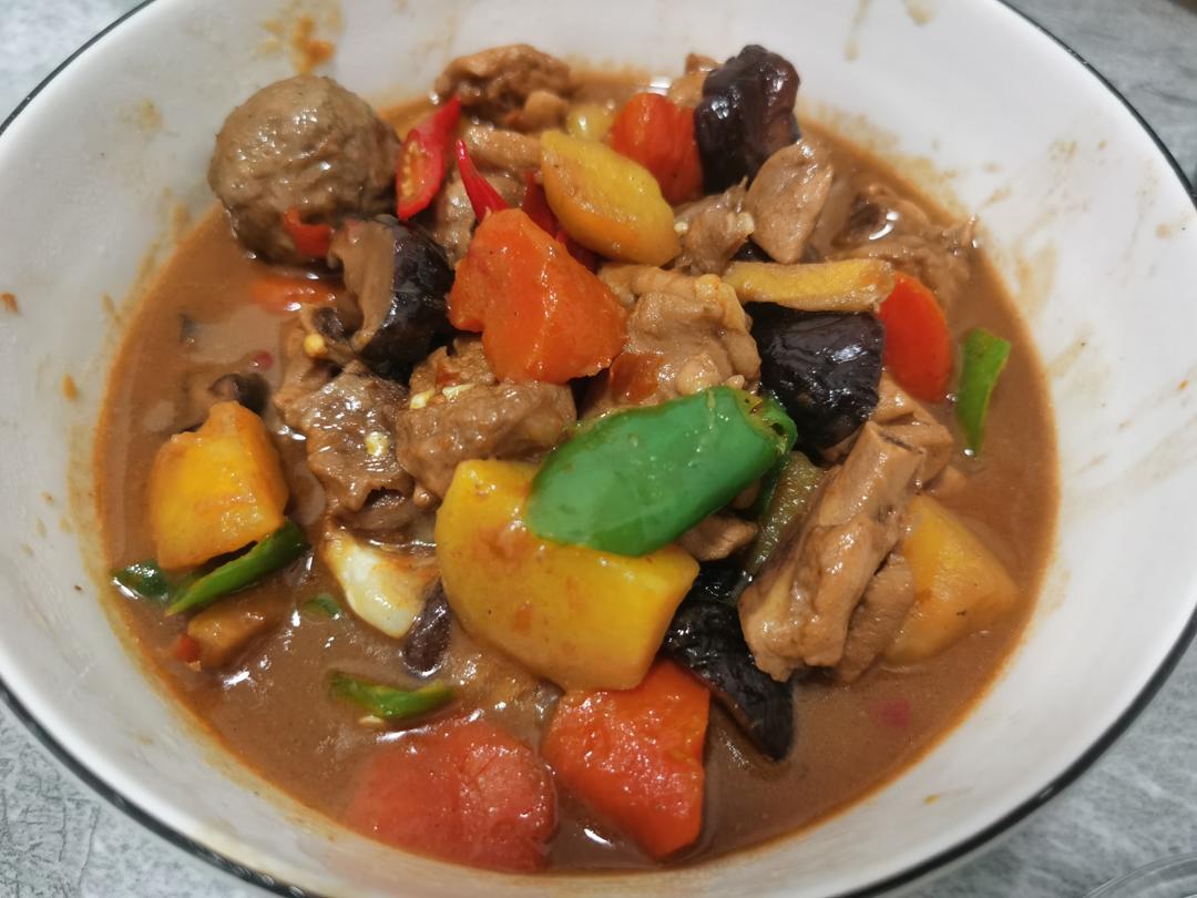 2、姜蒜炒香加鸡腿炒致变色,加入调味汁,加入所有配菜,加水刚好没过鸡肉