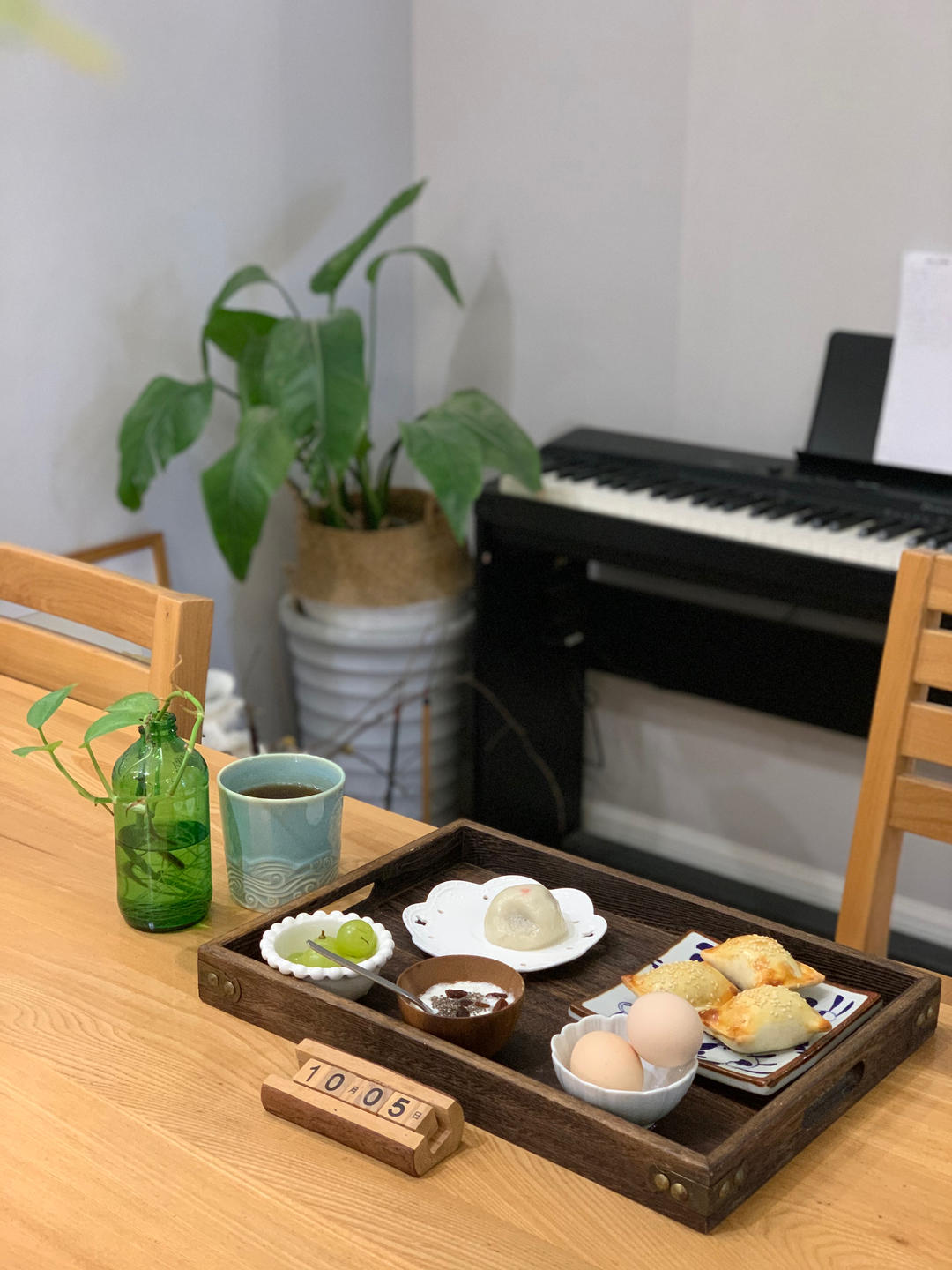 国庆假期d5。怎么那么快,眼睛一眨假期余额不足了。早饭:刚做好还来不及送冰箱钝化的酸奶,嫩嫩的。新疆烤包子、枣泥糯米团子、白煮蛋、酸奶、阳光玫瑰葡萄、普洱茶。新开启一瓶茶叶,twg的普洱,味道的确好,很温润。中饭:猪肉荠菜饺子🥟。下午茶:酸奶酒酿小圆子、抹茶巧克力饼干。酸奶我自制,酒酿老爸自制。晚饭:老黄瓜海米炒油豆腐、毛豆炒咸菜、花菜炒肉片、鱼头和海鲜豆腐都是外卖。餐后来一盆刚到的石榴,超级新鲜,颜色粉粉嫩嫩,看着就喜欢。