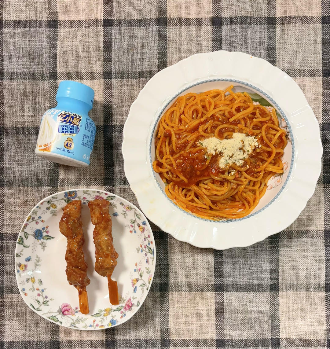 早安,周五。番茄肉酱面,五香肉串,牛奶。