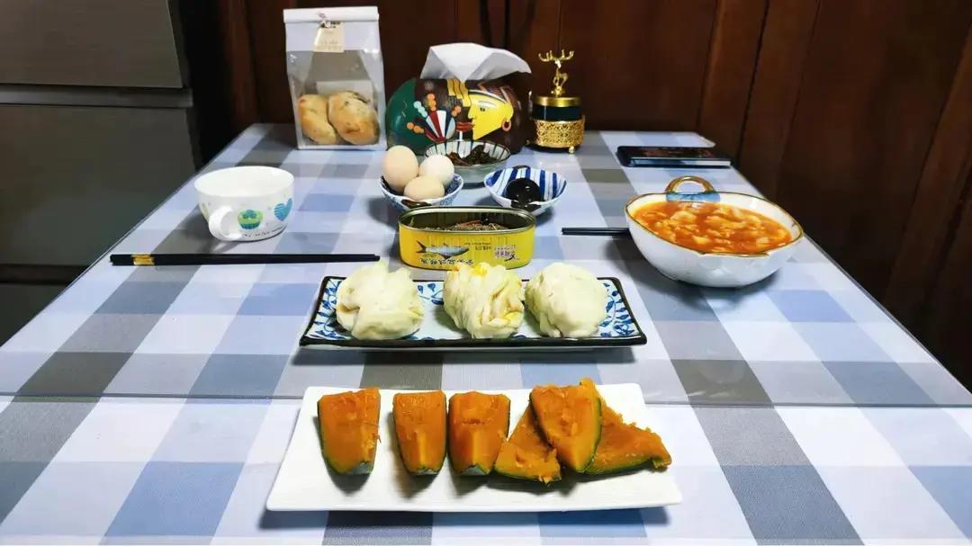 今天寒露,冷了,小雨,9~14度,空气优,早餐:西红柿揪片、奶、花卷、欧包、板栗南瓜、煮蛋、酱菜、鱼罐头,天冷了食欲好😊