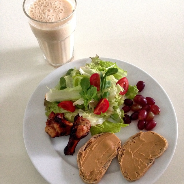 烤翅根,花生酱抹全麦面包,木瓜香蕉酸奶昔,沙拉生菜及红提。