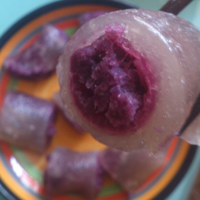 水晶紫薯卷,还不错哦!切记西米不能和的太稀,否则根本卷不了