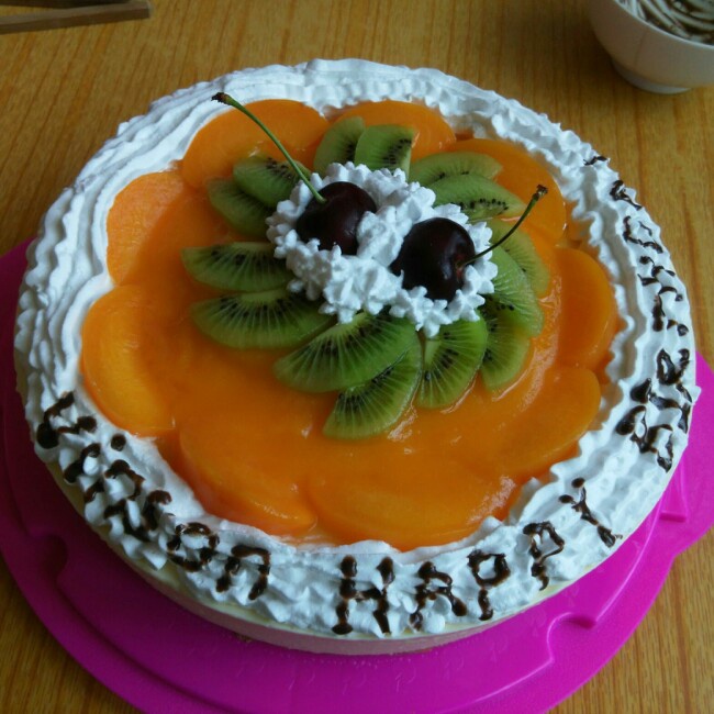 第一次做有裱花装饰的扁桃芝士慕斯生日蛋糕。