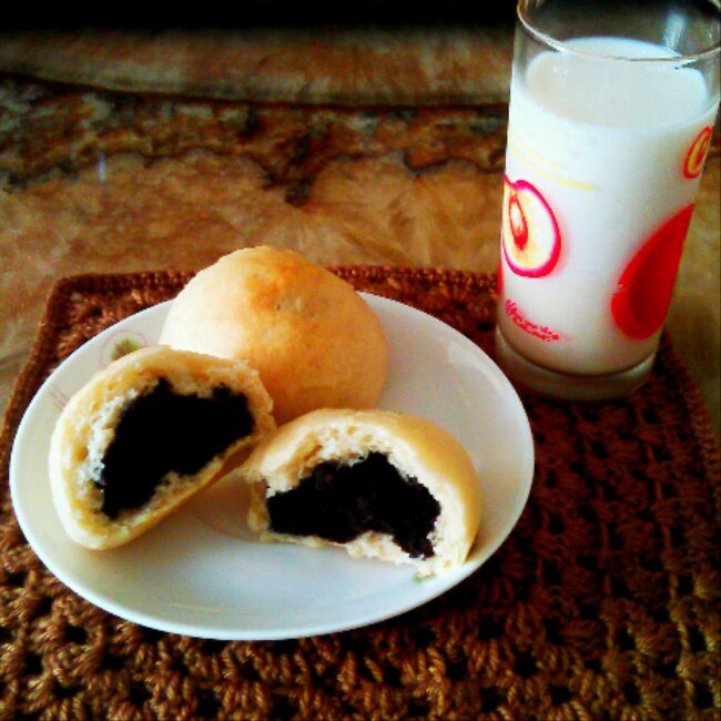 昨天晚上和小屁孩一起撸的豆沙包,今天当早餐~熬豆沙手都酸了。。...
