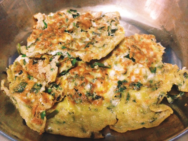 第一次做九層塔煎蛋很成功!祕訣就是火要小,不要隨便翻動雞蛋,等表面蛋漿幾乎凝固不隨便流動才翻過來。