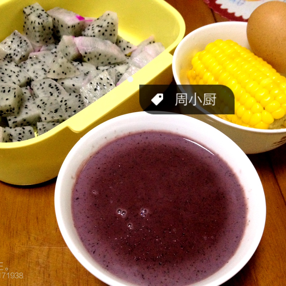 黑米牛奶,一个火龙果半个玉米一个鸡蛋~最近睡觉一直做很多很奇怪很奇怪的梦睡不好啊睡不好一直梦工作,希望快到国庆吧~~~早...