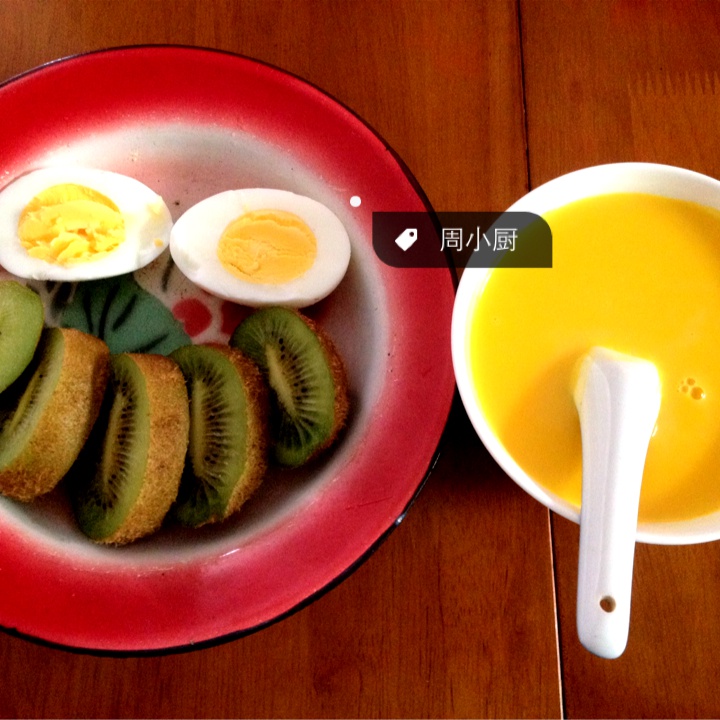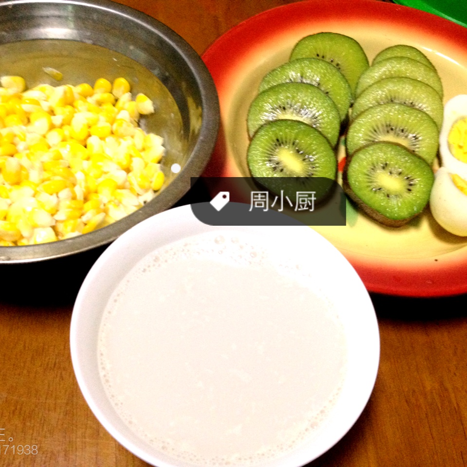 玉米沙拉、黄豆花生浆、两个猕猴桃再加一个鸡蛋,元气早餐biu~