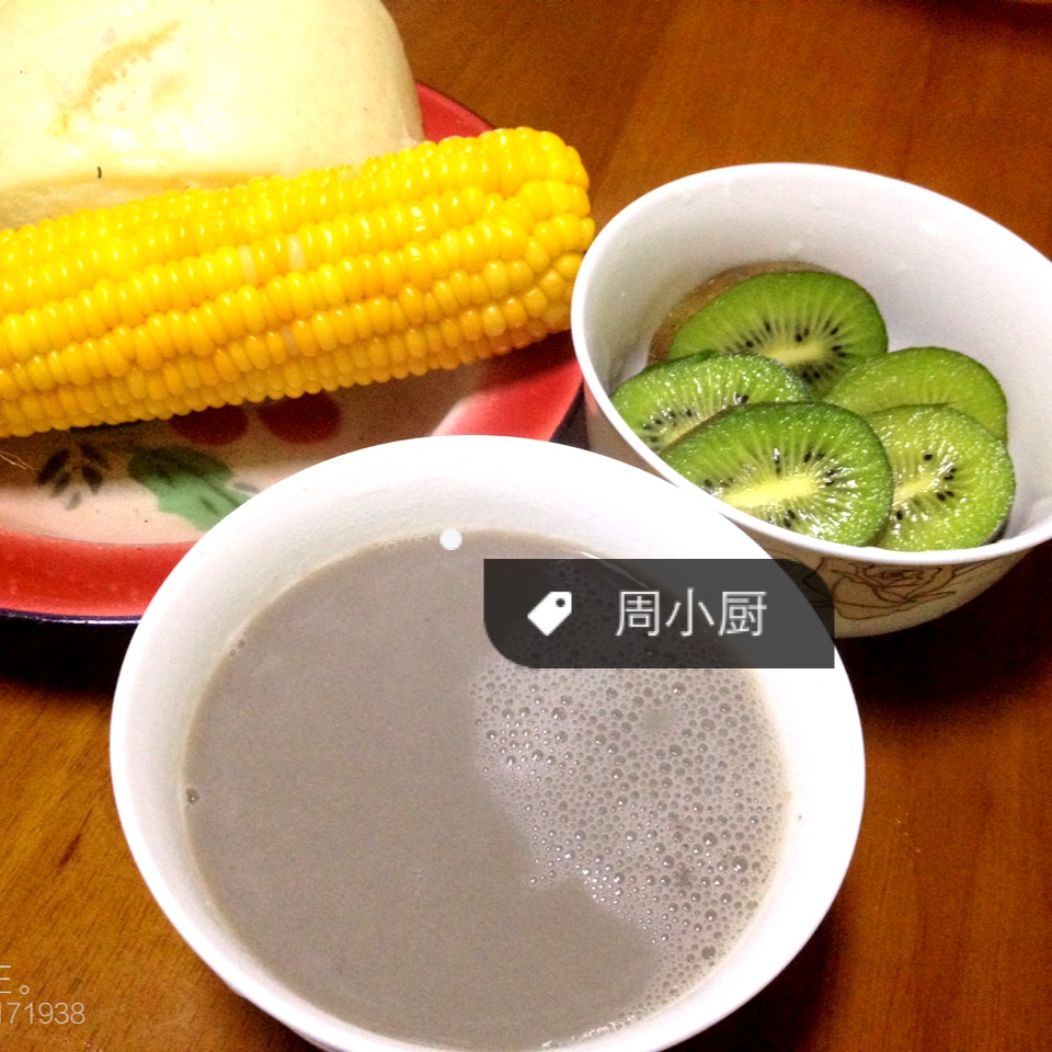一个带有芝士片的馒头一根玉米一个猕猴桃一碗黑豆红豆绿豆黄豆豆浆~一个女孩子早上会不会吃太多~嘻嘻嘻嘻~~其实玉米肯定吃不...