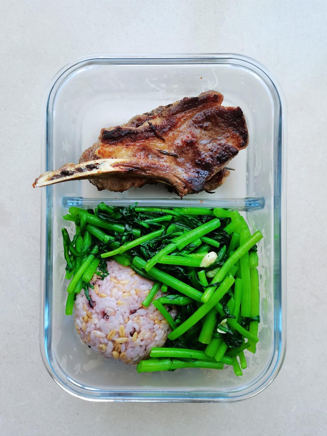 今日便当,煎羊排,清炒茼蒿,燕麦黑米饭🍱