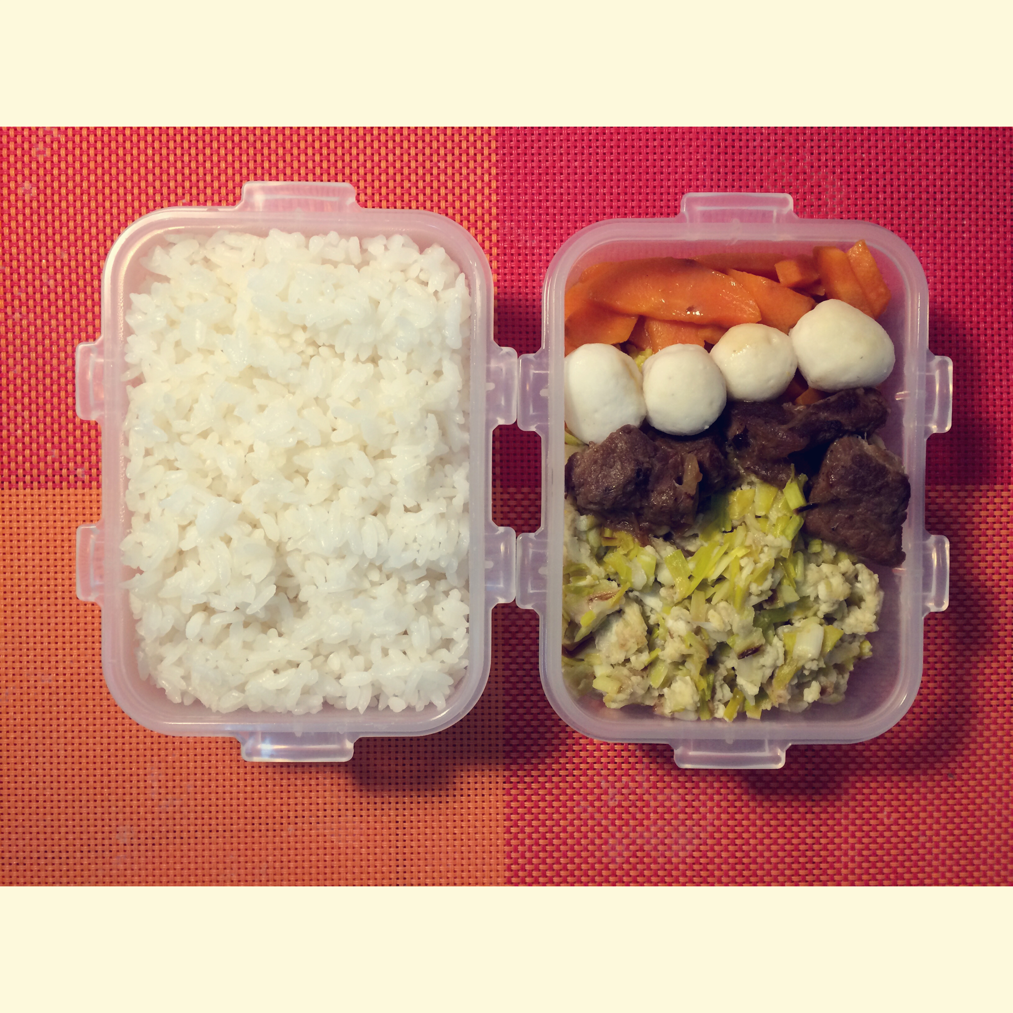 20151123 韭黄鸡蛋,炖肉,虾丸,清炒胡萝卜