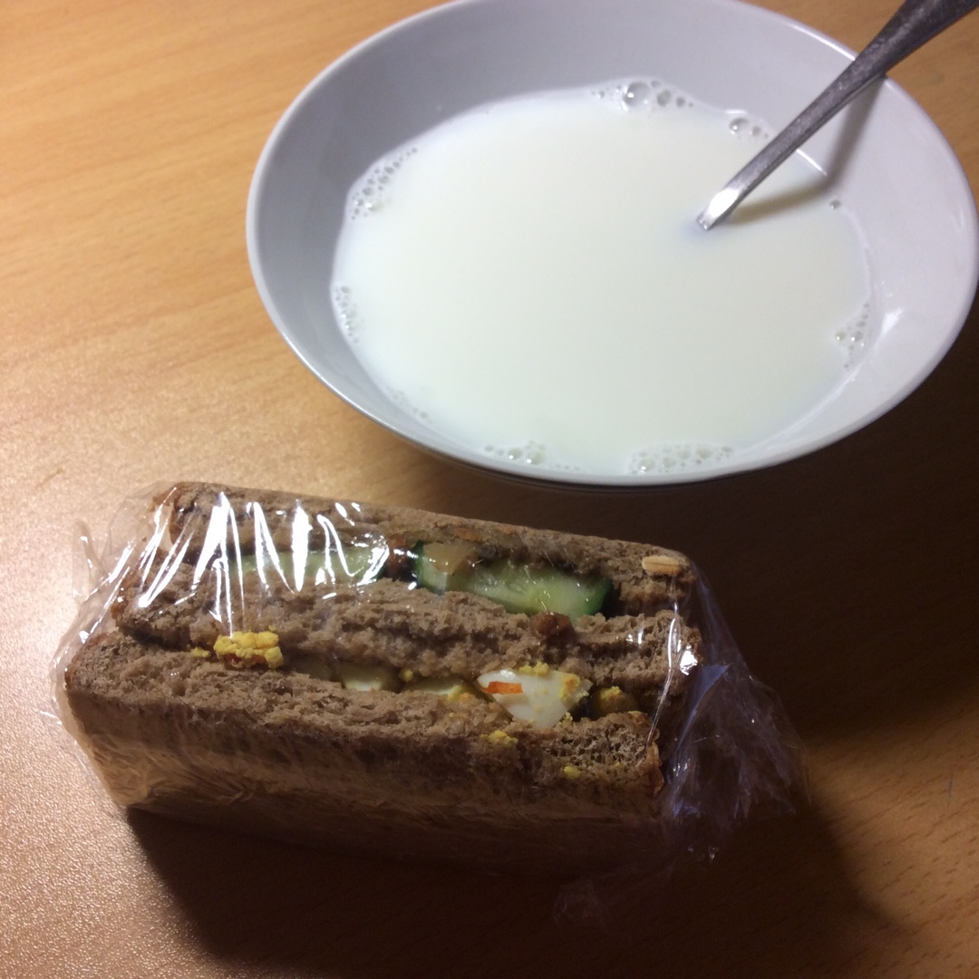 自搭全麦鸡蛋三明治 用蓝边碗泡牛奶,呵呵 第一次用它居然是泡牛奶😅