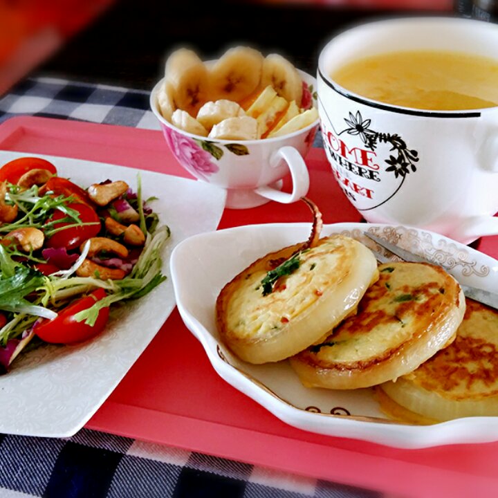 土豆鱿鱼饼,蔬菜沙拉,胡萝卜热牛奶,水果。
