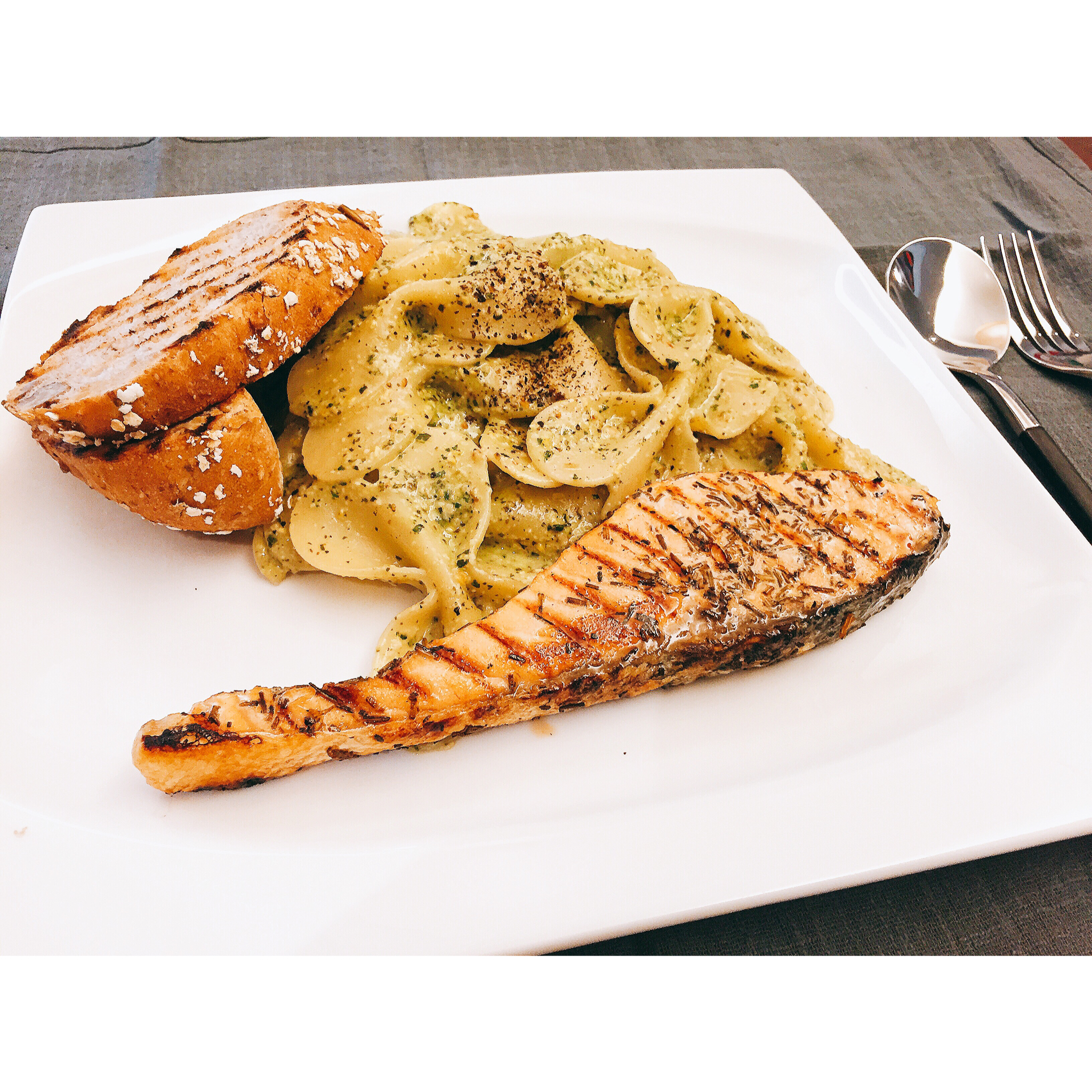 为了明天的Fit Time拍摄,先把这道菜做一遍。还买了特别的蝴蝶结意大利面,配上青酱和面包,好吃到不行 #午餐•201...