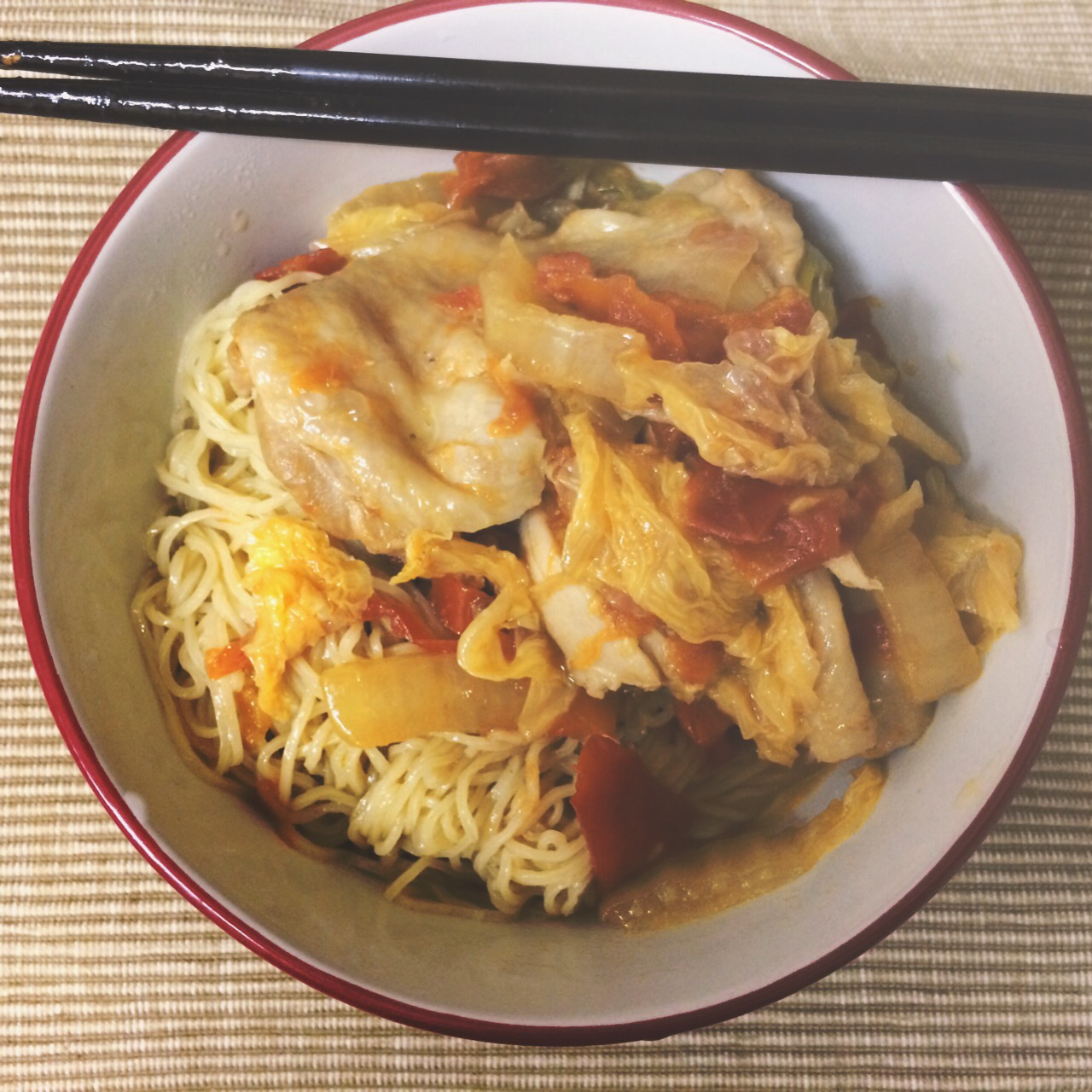一只鸡腿加基础的番茄白菜葱姜酱油炖了半小时,汤的味道已经好极了……配了粤式的碱水面是因为上次买多了吃不完……做之前就觉得...