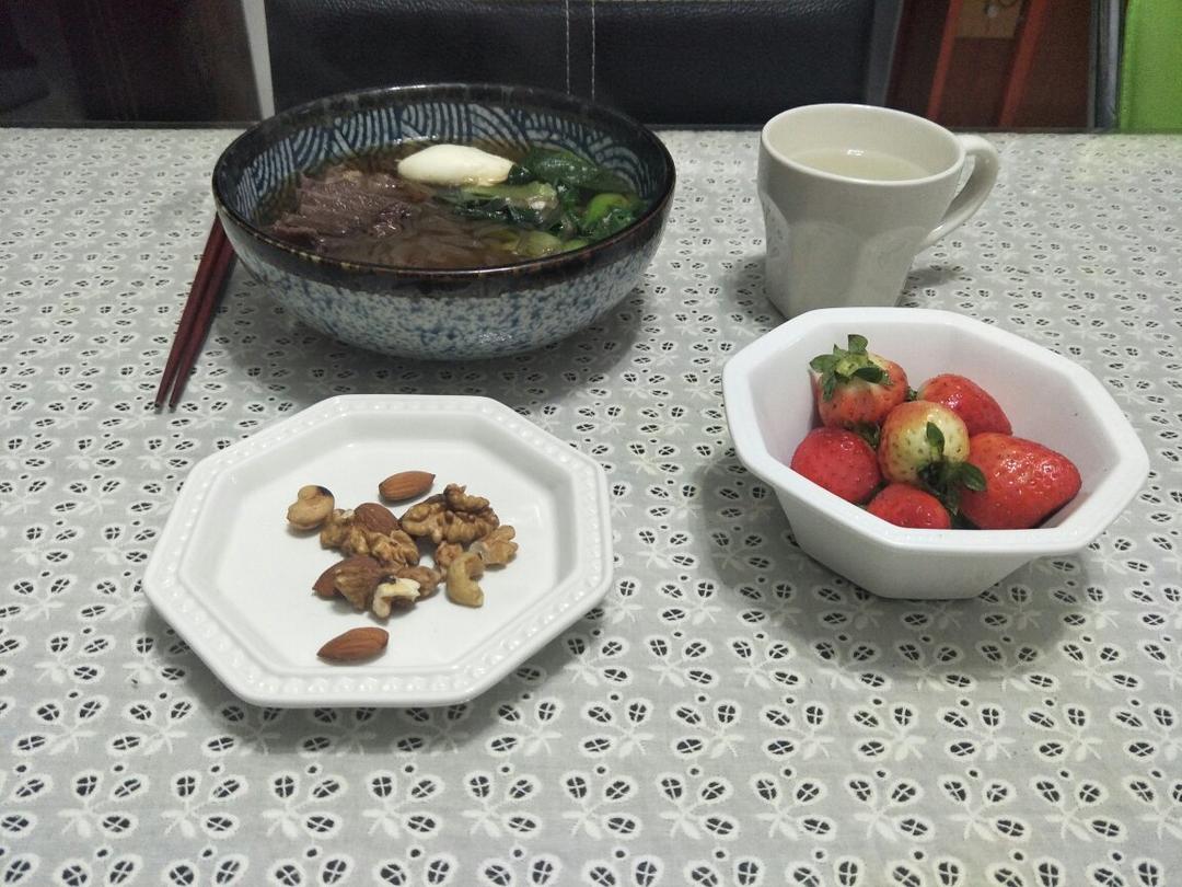 日常…牛肉粉丝汤,蜂蜜水,坚果,草莓。