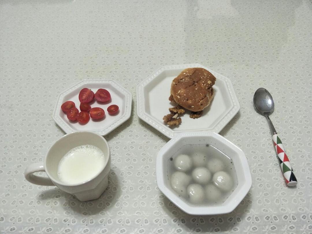 汉堡,坚果,番茄,汤圆,牛奶。日常