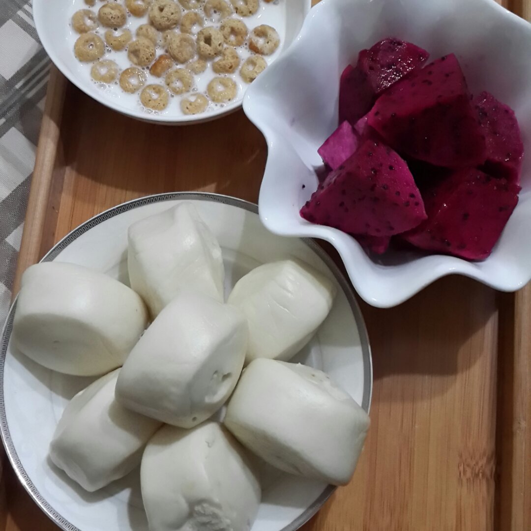 牛奶泡米果,小馒头,水果是红心火龙果