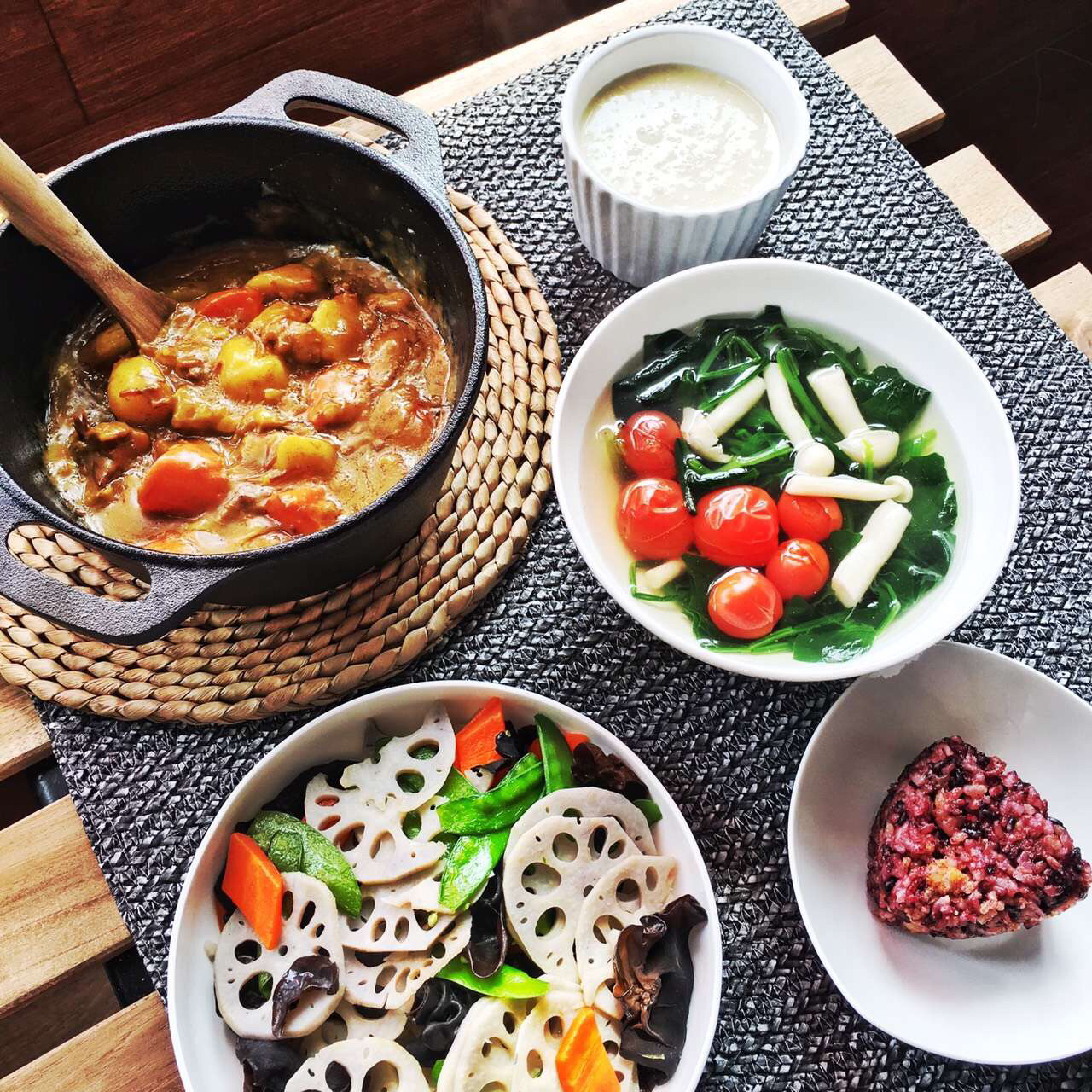 早餐。咖喱牛腩,清炒藕片荷兰豆木耳,菠菜菌菇汤,美龄粥,杂粮饭团。
