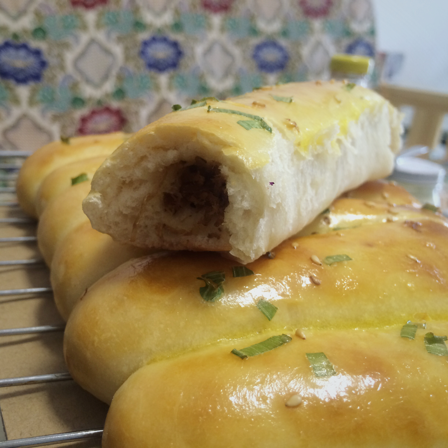 做出来很成功,用的是自己做的肉松,还特地挤了些沙拉酱,吃起来很松软,味道也够。简直大爱啊