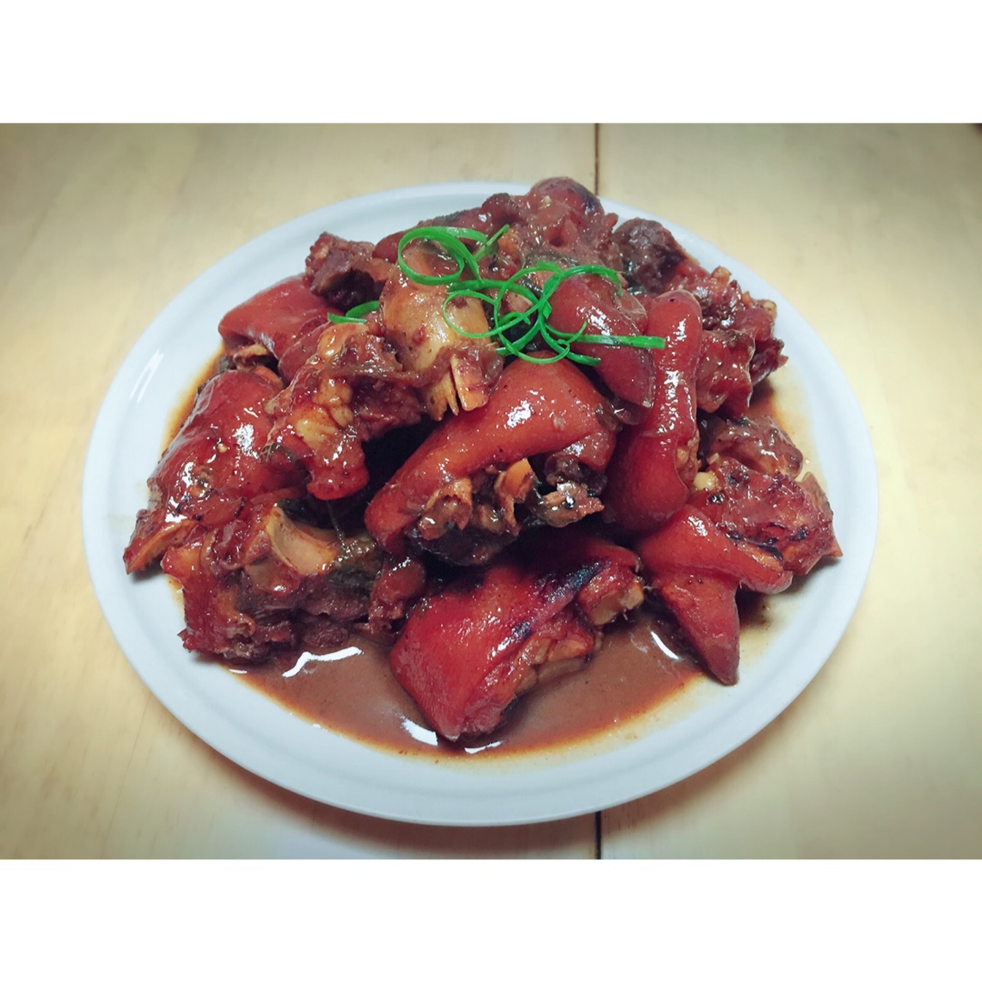 红烧猪蹄,红烧豆腐,蛋饺,拳炒狗齿菜
