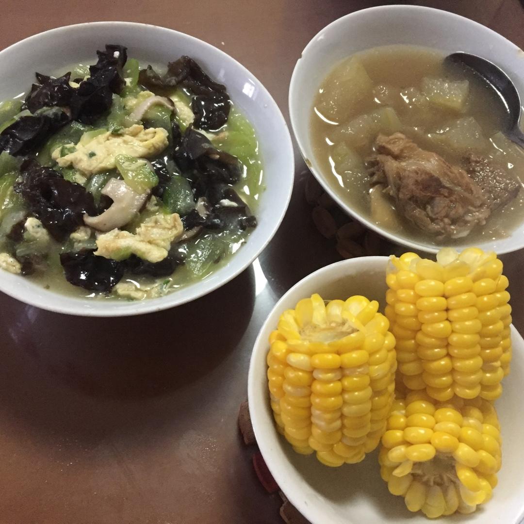 夏老师的早餐:玉米、冬瓜排骨汤、黑木耳黄瓜香菇炒蛋(没有肉片的木须肉)😁