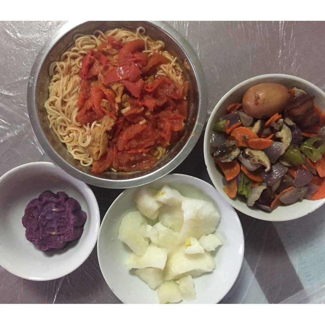 我给妈妈烧的早餐:番茄盖浇面、炒素(胡萝卜、青椒、香菇、紫洋葱)、一颗蛋一块肉(之前烧的热了一下)、一只鸭梨、一块穆桂英...