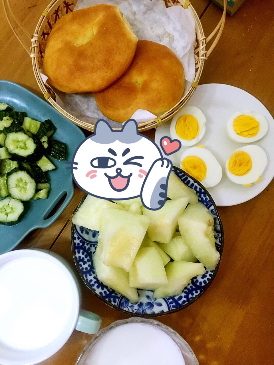 周三好开森💃💃💃早餐,面包,鲜🐂奶,拍黄瓜😜😜鸡蛋,水果🍈