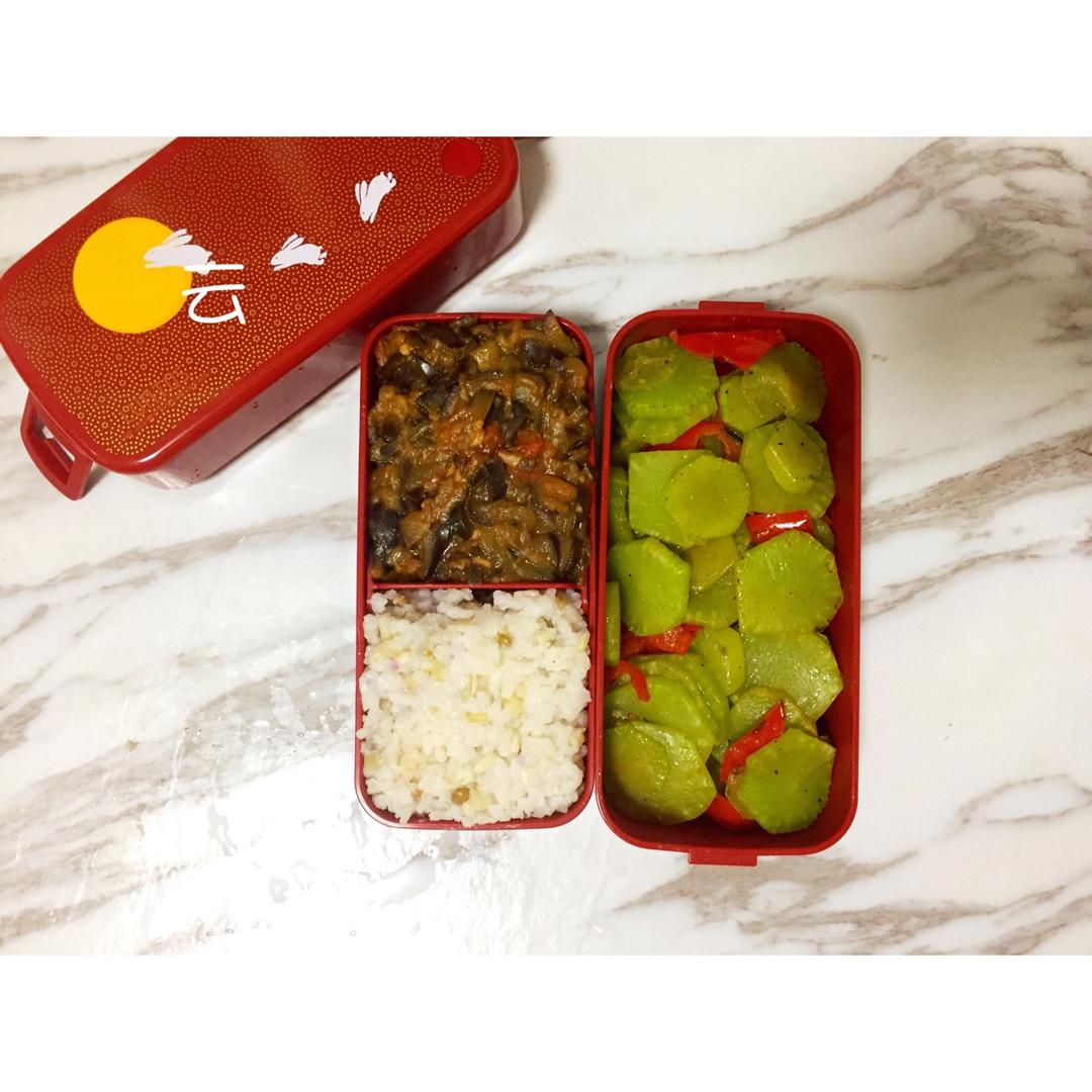 今日便当:米饭+莴笋+黄豆酱炒茄子