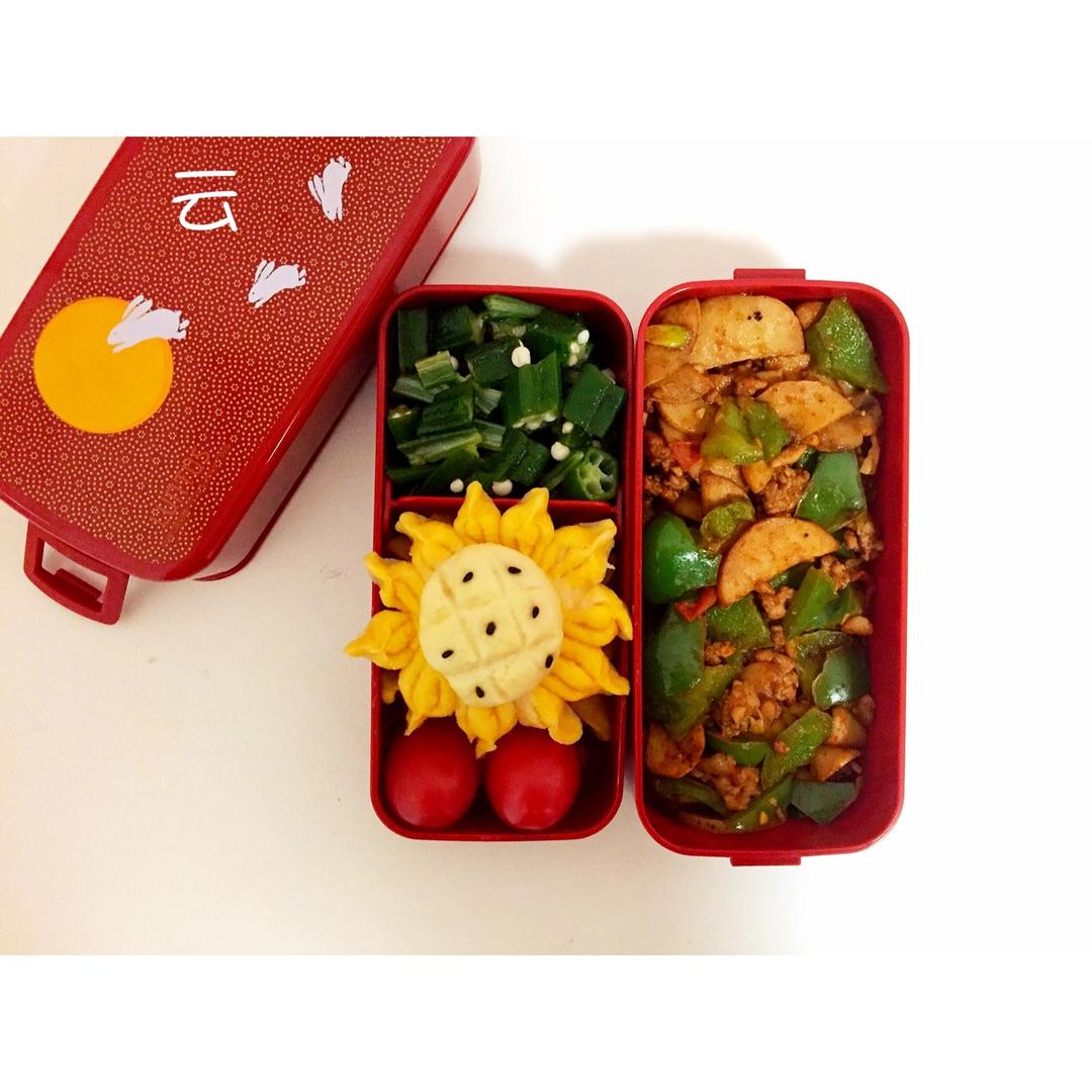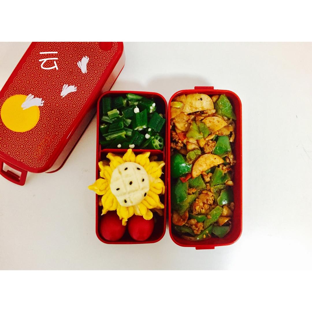 肉末炒杏鲍菇+凉拌秋葵+小葵花馒头[em]e400118[/em]