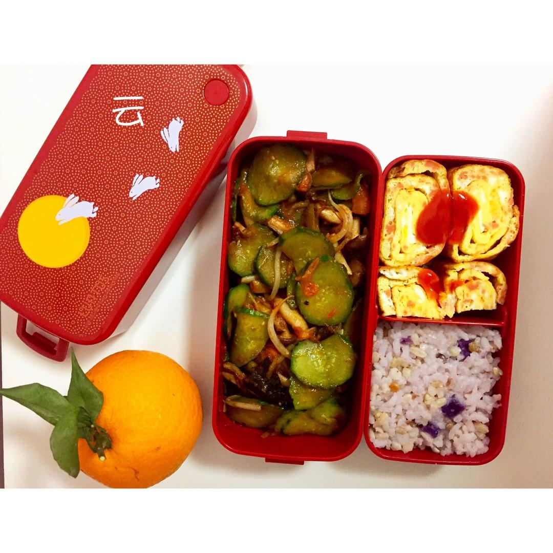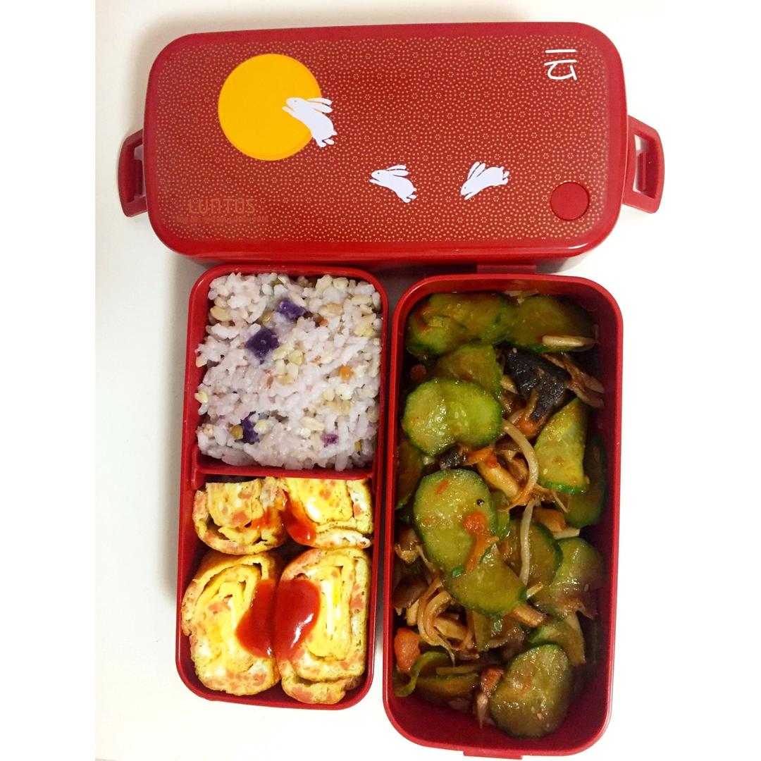 从今天开始,每天做健康便当,和外卖说拜拜!杂粮米饭+厚蛋烧+黄瓜炒蟹味菇。少油少盐多健康。坚持✊