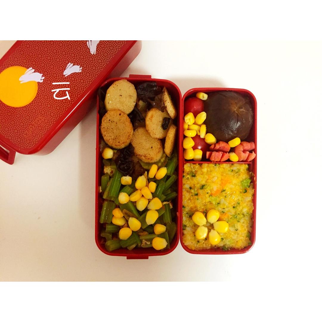 今日便当:南瓜藜麦二米饭+炖香菇+炒香芹+山药木耳