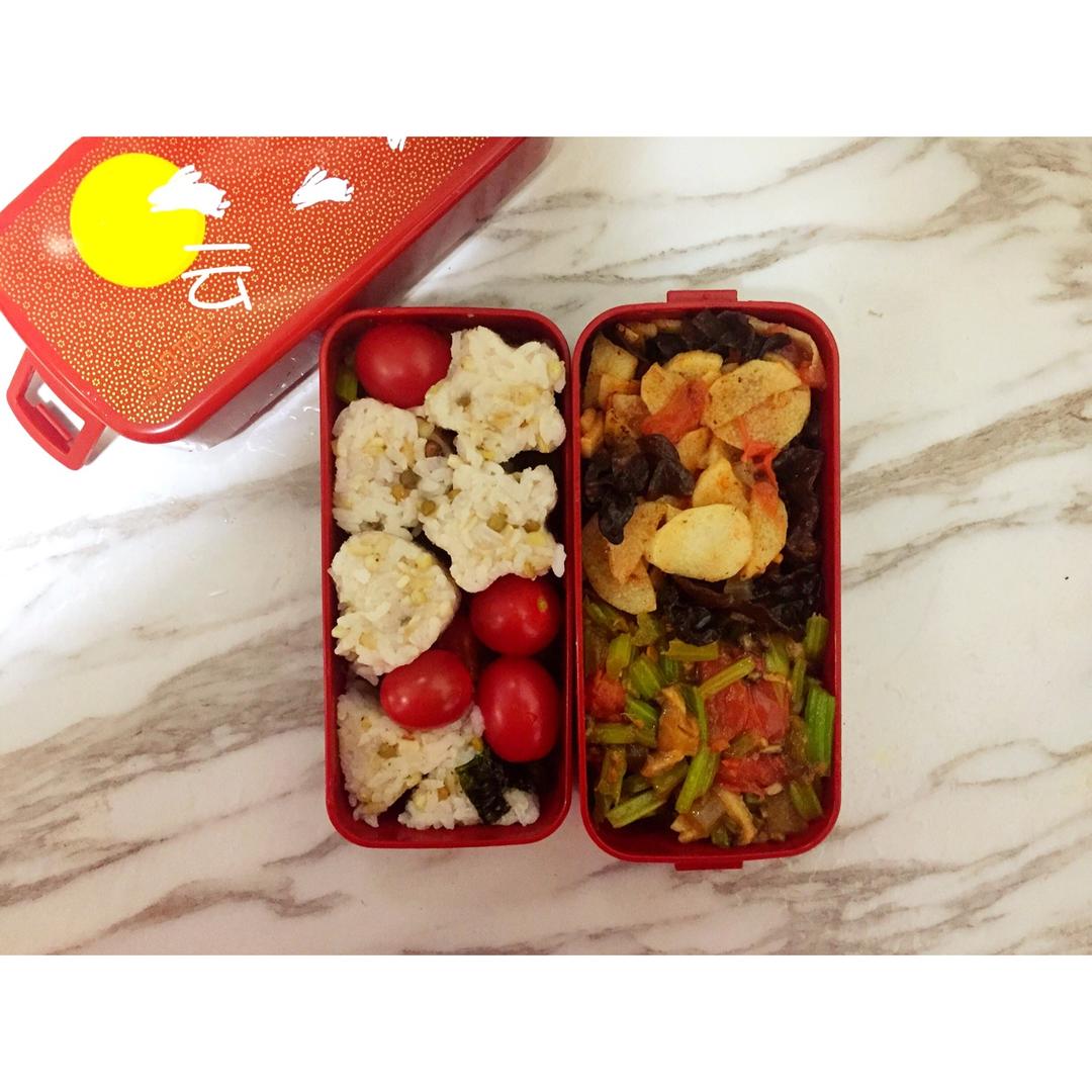 今日便当:粗粮饭团:+山药木耳+香芹烩香菇+小西红柿