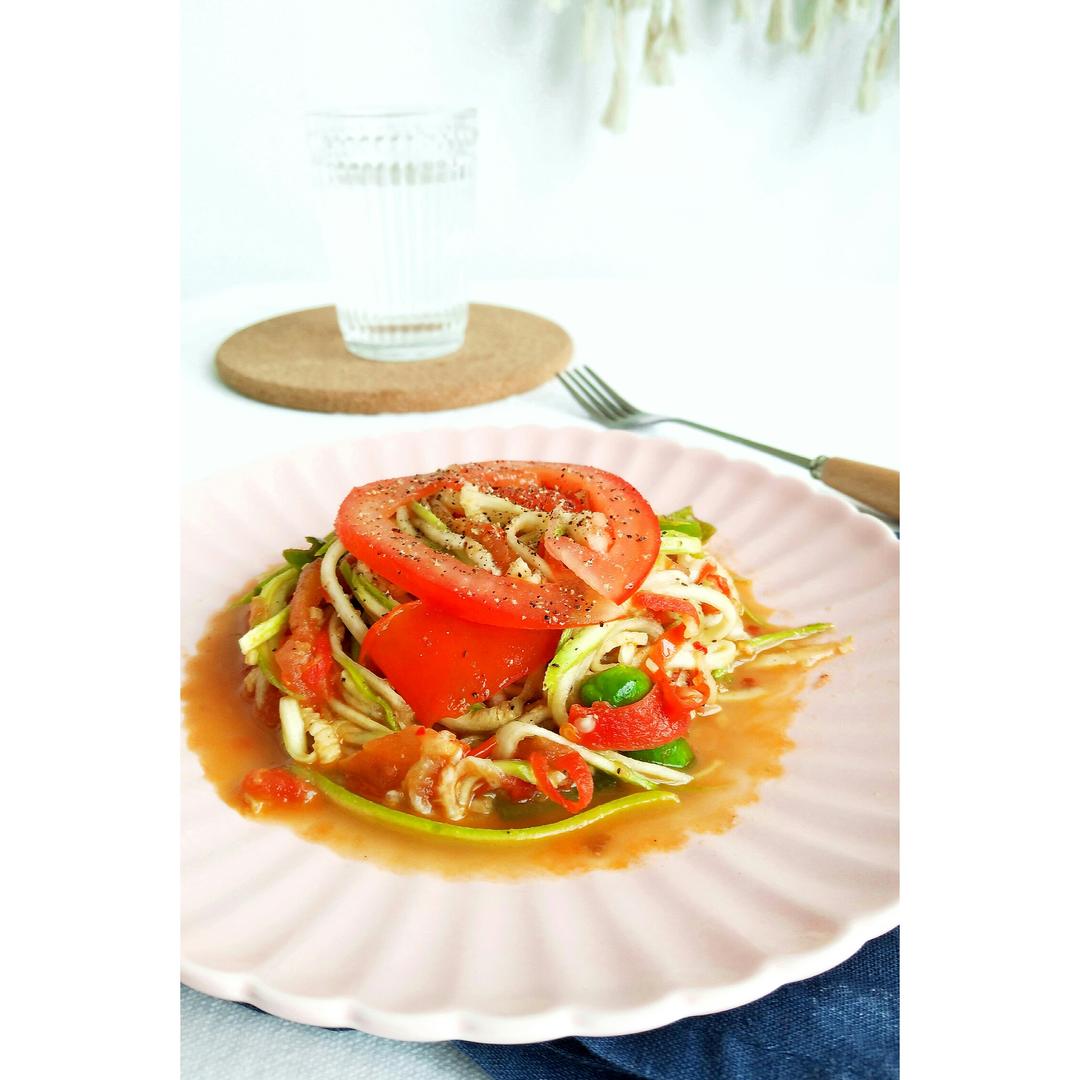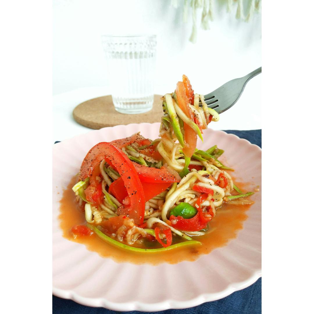 先炒的番茄软了后关火放入西葫芦面条调味...