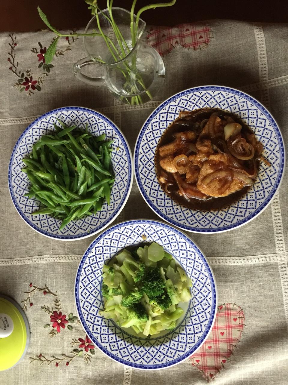 两素一荤。西兰花 四季豆 葱烧大排