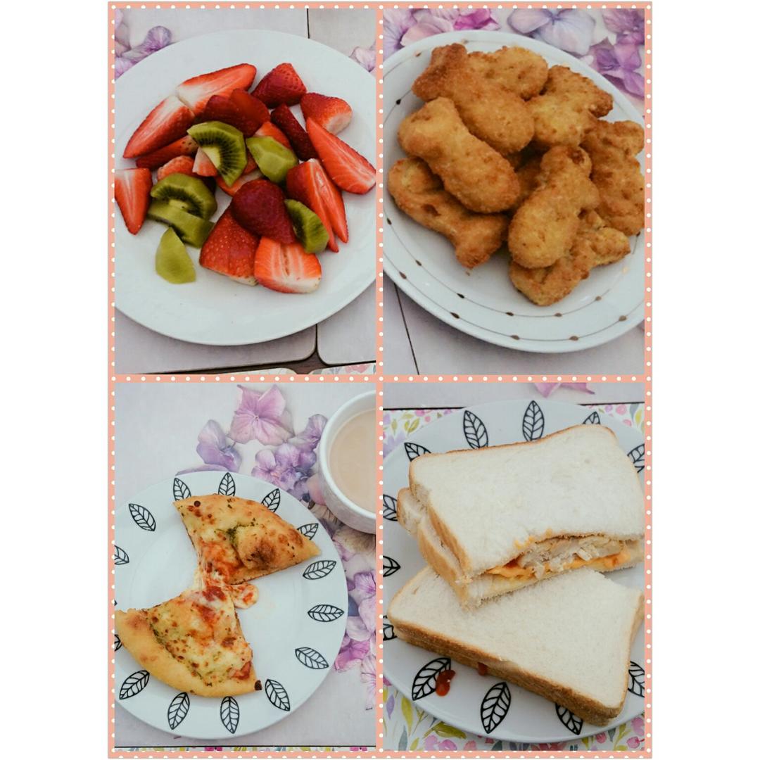 其实是早餐加午餐,早餐是水果和披萨奶茶,炸鱼条,鸡腿芝士三文治是午餐