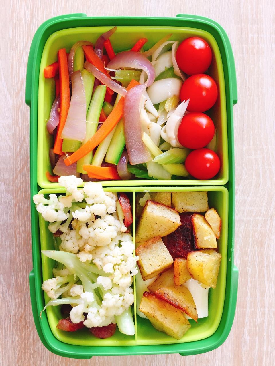 食記·花菜炒腊肠、蒸山药、椒盐土豆、红萝卜洋葱芦笋、西芹百合、圣女果
