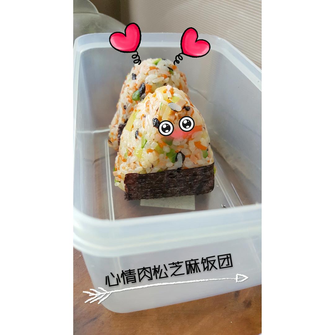 改良了一下,饭团捏成三角形,里面加了肉松和芝麻。好吃!吃完一个大饭团有点渴...