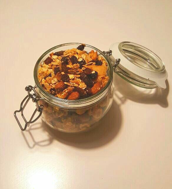 坚果和葡萄干随意加的,2大勺蜂蜜一大勺枫糖一大勺椰糖半大勺橙味橄榄油几滴香草精,椰子片替代椰...
